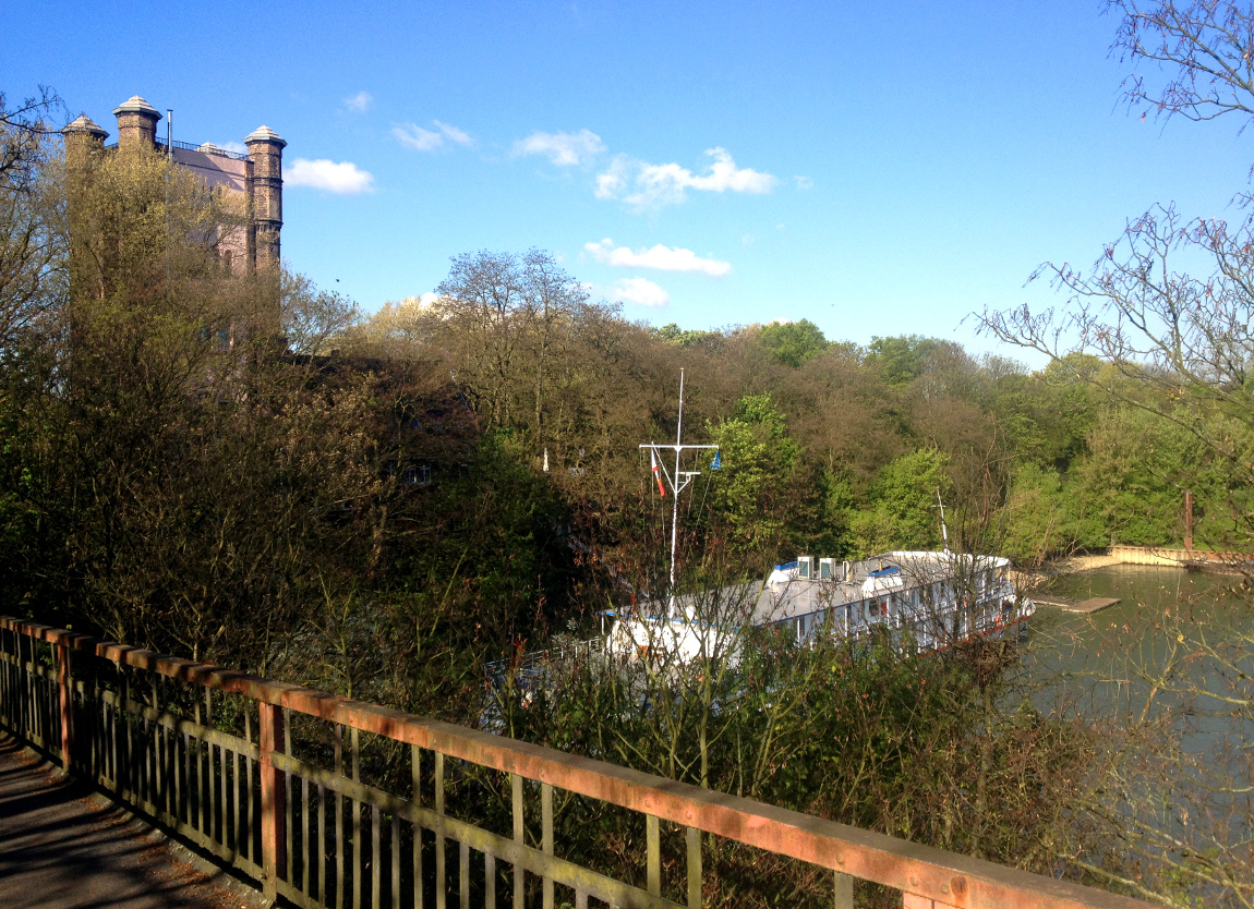 Neben dem Hafenbecken seht ihr hinter den Bäumen auch das dort liegende Schulschiff sowie links den Homberger Hebeturm.