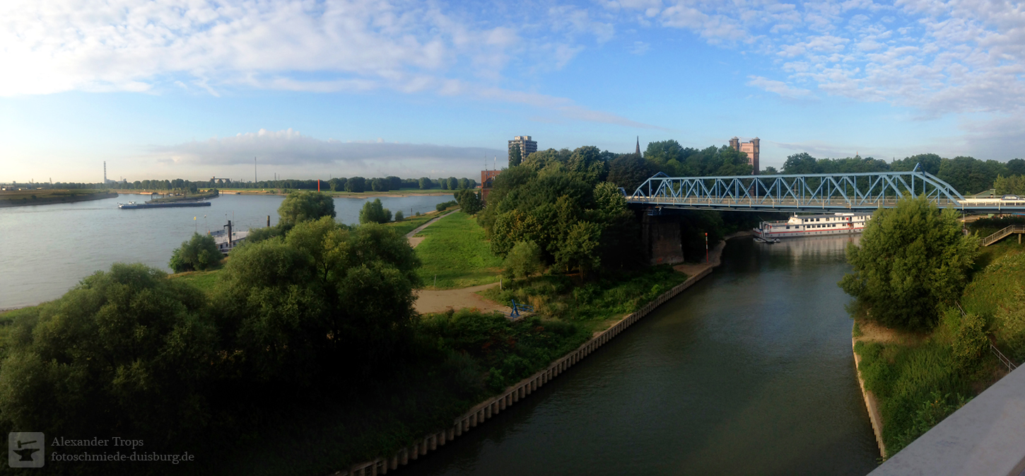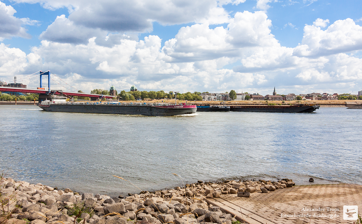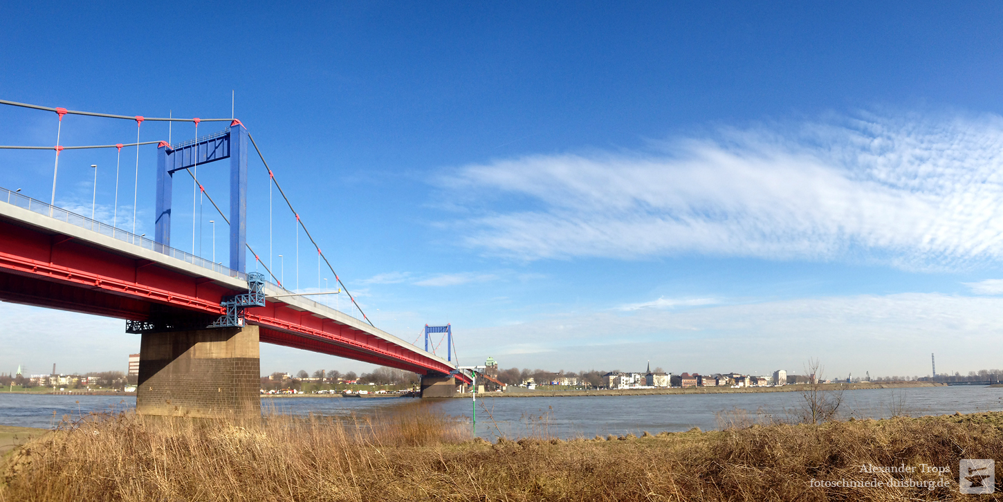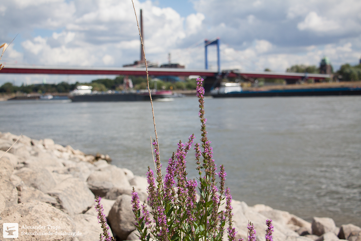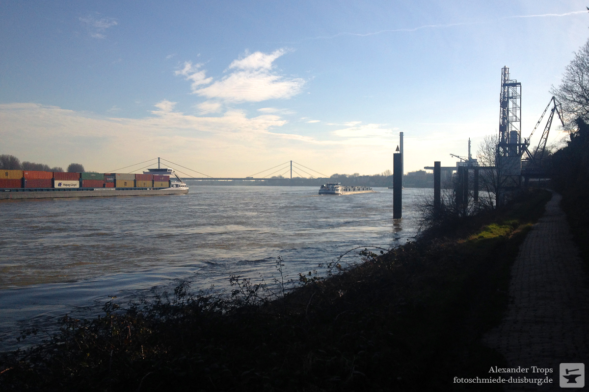 Im Hintergrund erkennt man auch so gerade noch die Friedrich-Ebert-Brücke, den Duisburger Hafenstadtteil Ruhrort sowie zwei den Rhein entlang fahrende Schiffe.