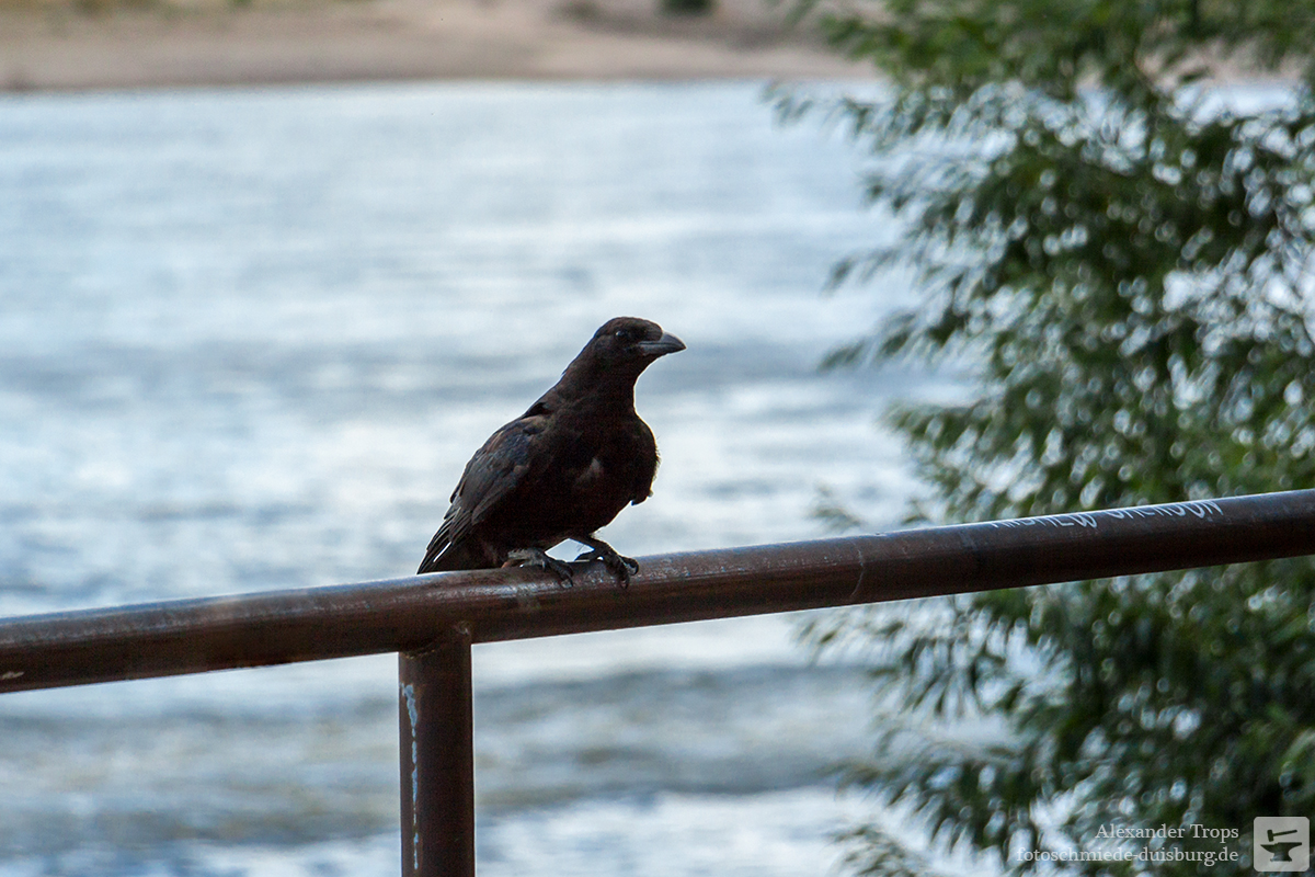 Diesmal handelt es sich um das Foto einer Krähe, die auf einem Geländer am Rheinufer in Duisburg-Homberg sitzt.