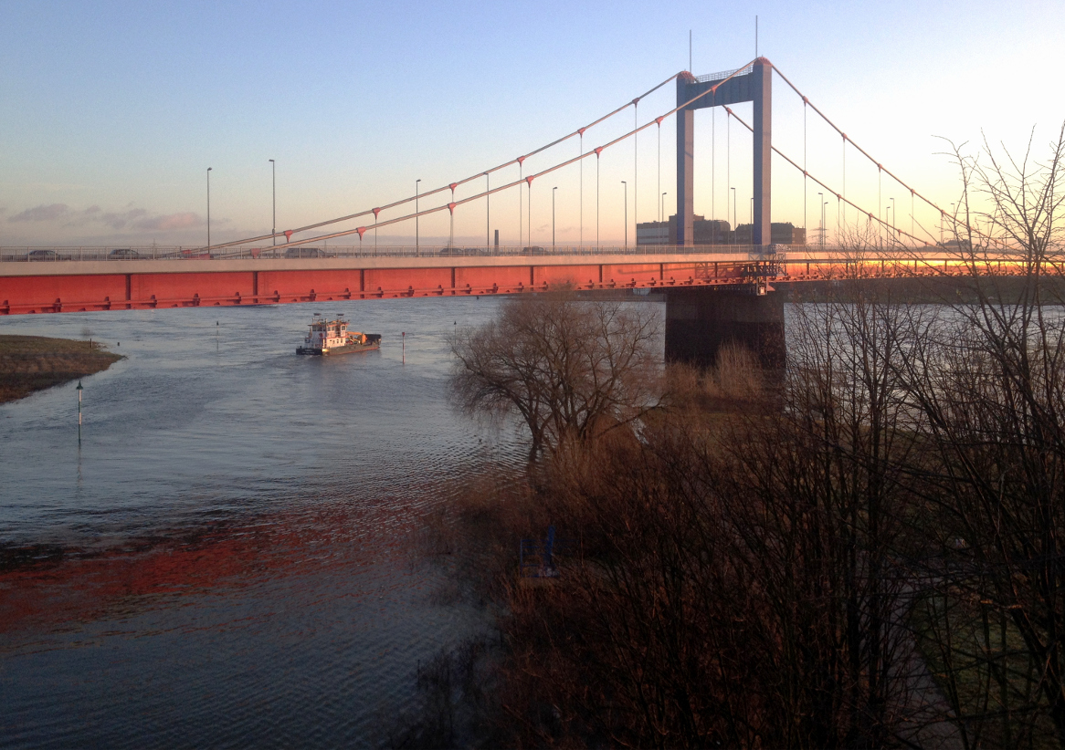 Am heutigen ersten Februar habe ich die Aufnahme einer Morgenstimmung für euch. Die ersten Sonnenstrahlen kamen gerade heraus, als ich dieses Foto der Friedrich-Ebert-Brücke, welche den Rhein zwischen Duisburg-Homberg und Duisburg-Ruhrort überspannt, gemacht habe.