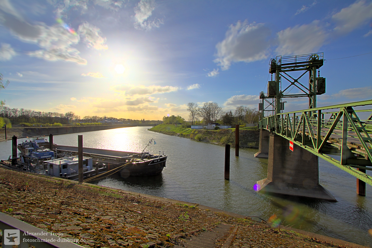 Und so präsentiere ich euch heute eine Aufnahme von der Homberger Rheinpreussenbrücke, wie sie die Einfahrt des Rheinpreussenhafens (im linken Bildbereich zu sehen) überspannt.